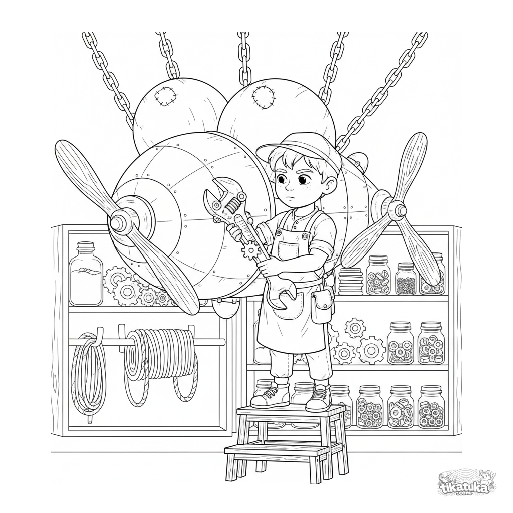 Detailliertes Ausmalbild für Kinder 10-12: Ein Jungen-Erfinder repariert eine komplexe Flugmaschine in seiner Werkstatt.