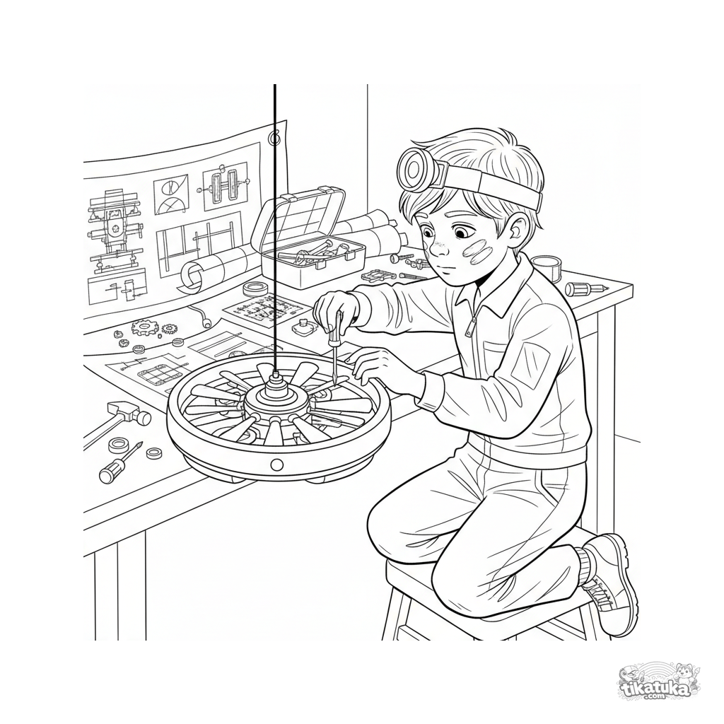 Detailliertes Ausmalbild für Jungen 10-12: Ein junger Erfinder repariert eine fliegende Drohne in einem geheimen Labor, umgeben von Werkzeugen und Schaltplänen.