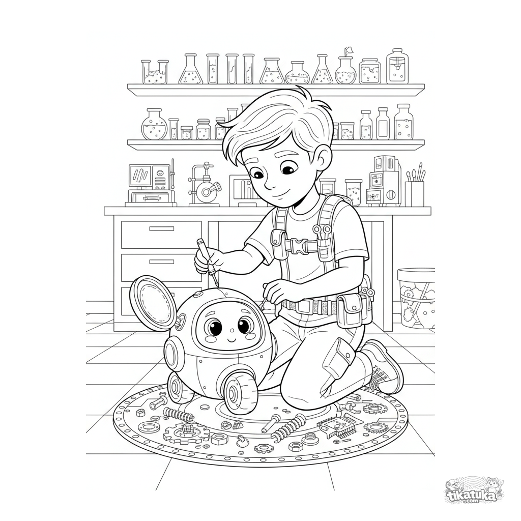 Detailliertes Ausmalbild für Kinder 10-12: Ein junger Ingenieur repariert im Geheimlabor seinen Roboter-Assistenten.