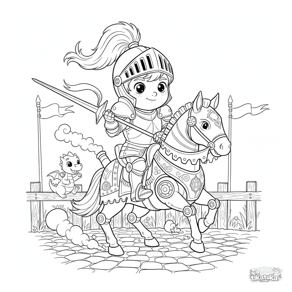 Detailliertes Ausmalbild eines Ritterjungen, der auf einem mechanischen Pferd beim Turnier kämpft. Für ältere Kinder von 8 bis 12 Jahren.