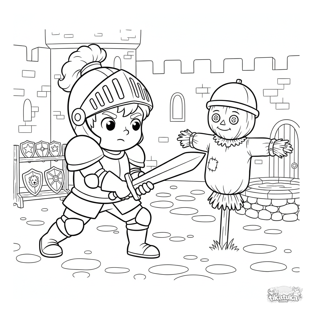 Ausmalbild eines Jungenritters, der mit einem Holzschwert gegen eine Strohvogelscheuche im Burghof übt. Für Kinder von 5-8 Jahren. Szene mit Rüstung und Übungsschilden.