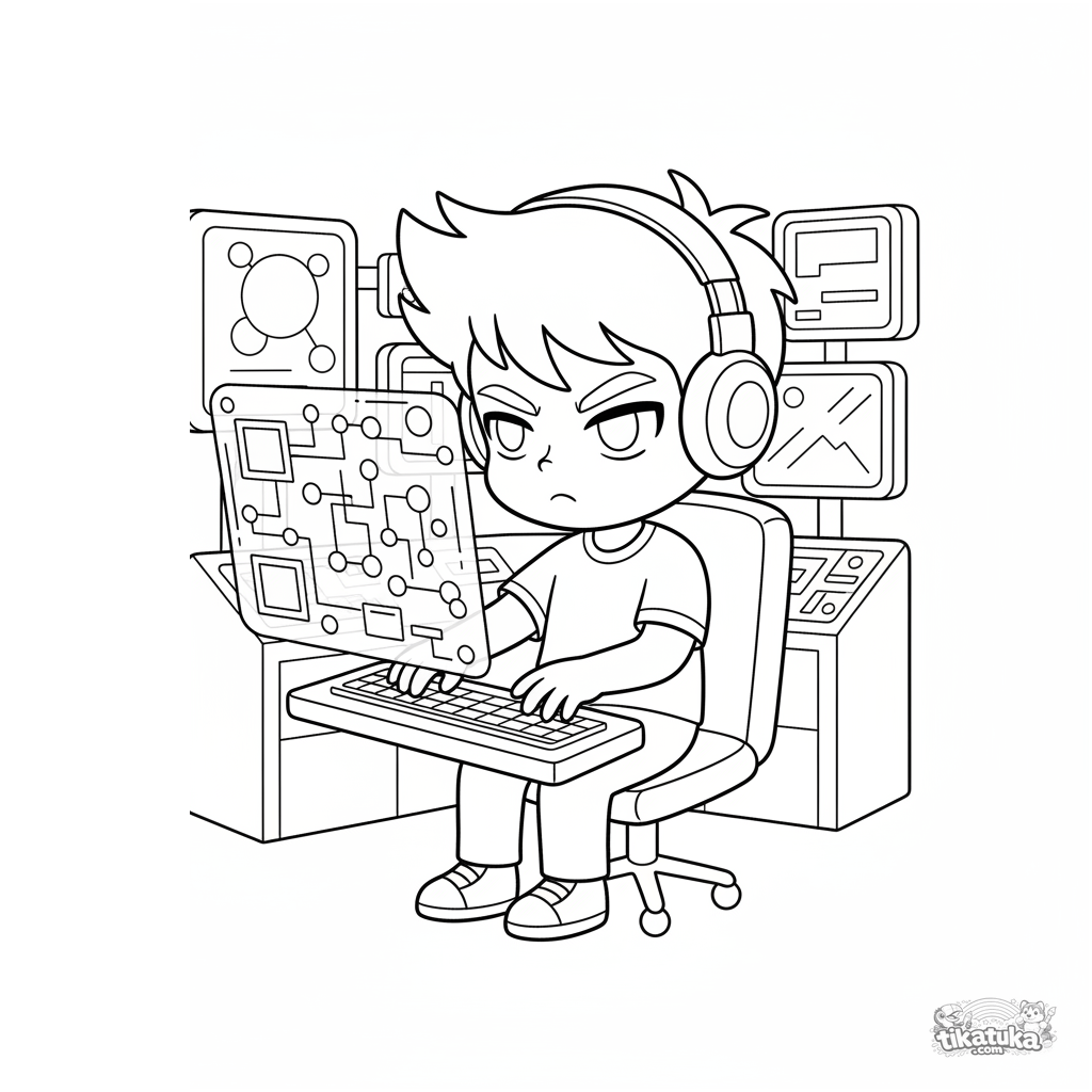 Ausmalbild für Kinder 7-9: Ein Programmiererjunge arbeitet an einer holographischen Schnittstelle im geheimen Hightech-Labor.