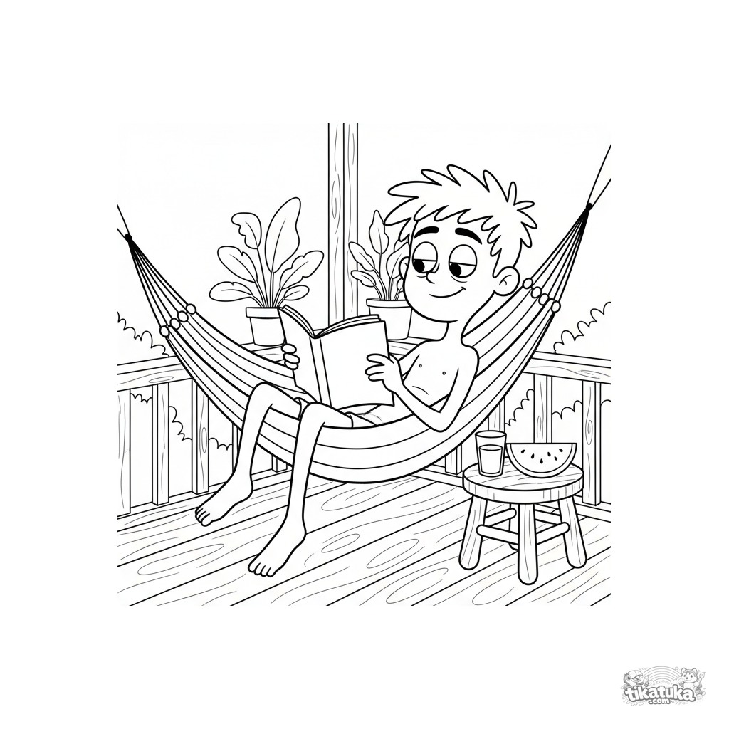 Ausmalbild für Kinder 7-9: ein Junge liest einen Comic, während er in einer Hängematte auf einer Sommerveranda liegt.
