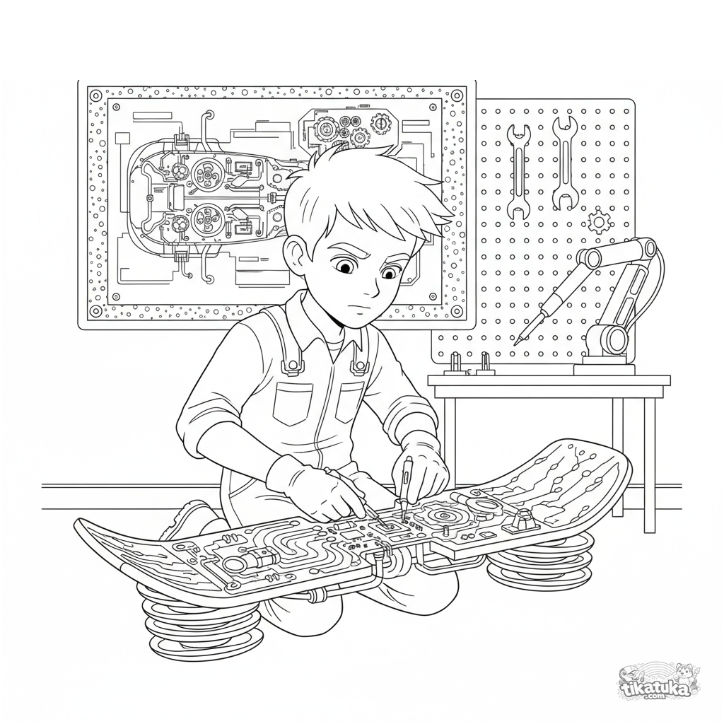 Detailliertes Ausmalbild für Kinder 10-12: Ein Ingenieursjunge repariert in einem geheimen Labor ein schwebendes Hoverboard anhand eines Schaltplans. Szene mit mechanischen Details.