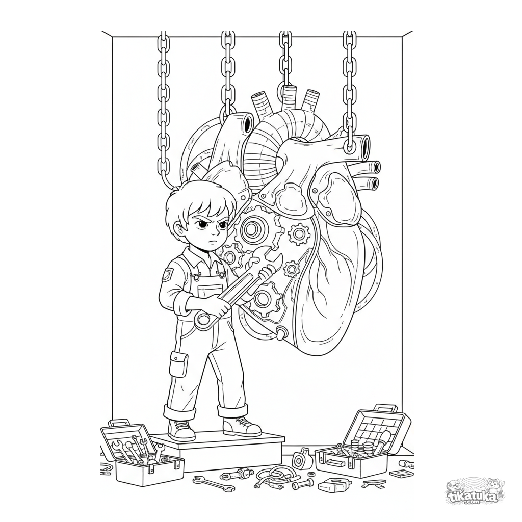 Detailliertes Ausmalbild für Kinder 10-12: Ein Junge repariert im Geheimlabor ein riesiges mechanisches Herz mit Zahnrädern und leuchtenden Röhren.
