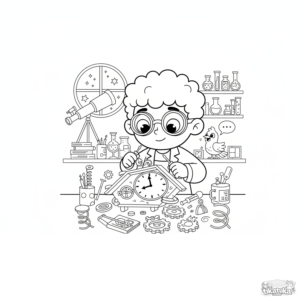 Ausmalbild für Kinder 7-9: Ein Junge mit Vergrößerungsbrille repariert eine sprechende Kuckucksuhr im Geheimlabor. Storybook-Illustrationsstil.