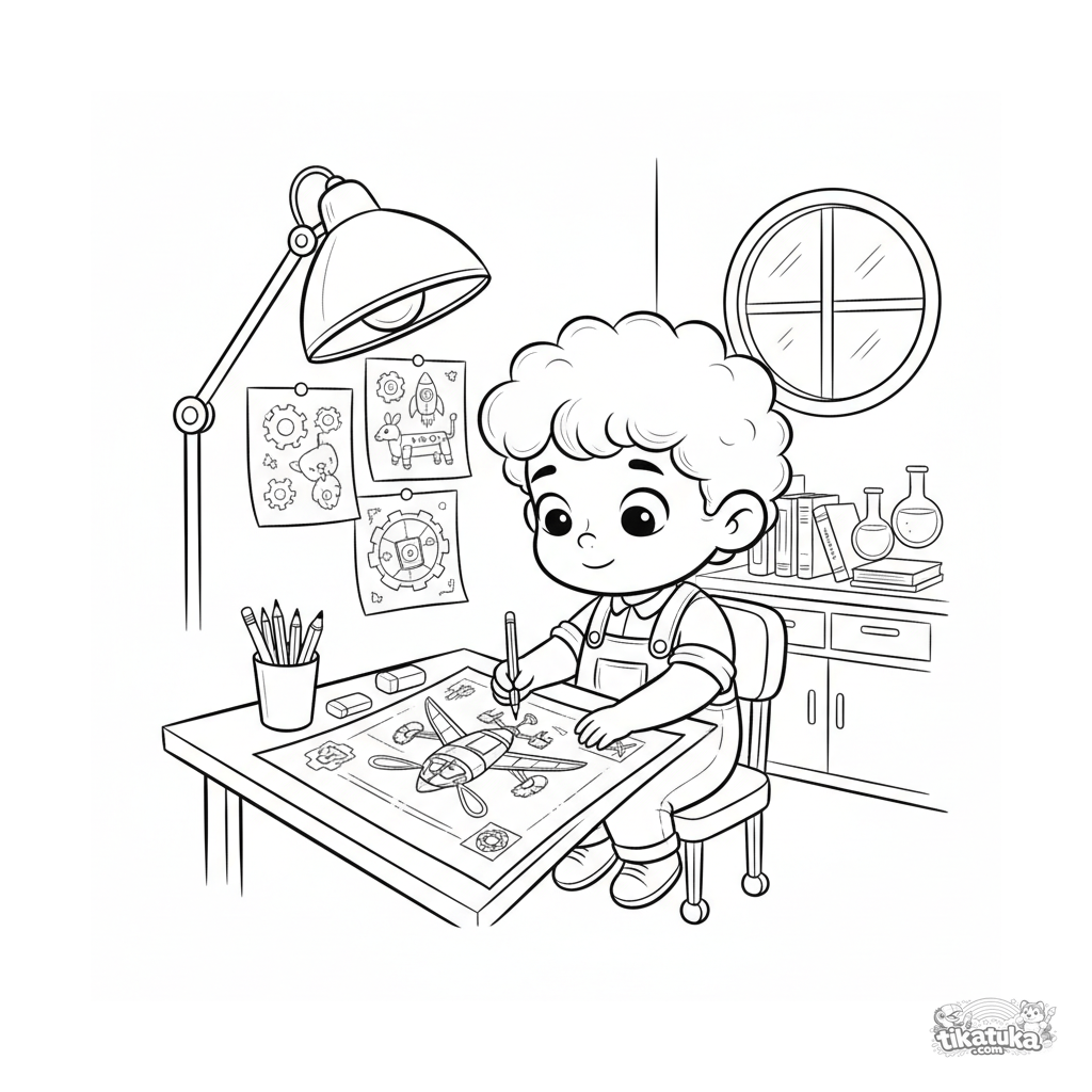 Ausmalbild für Kinder 7-9: Ein Junge im Labor am Zeichentisch, vertieft in das Zeichnen einer detaillierten Blaupause.