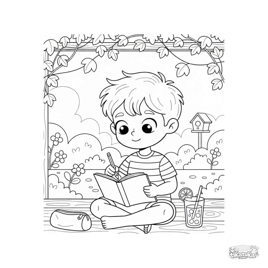 Ausmalbild für Kinder 4-6: Ein Junge sitzt auf dem Verandaboden und zeichnet den Gartenblick in ein Notizbuch. Stifte und ein Glas Limonade daneben. Klare Szene.