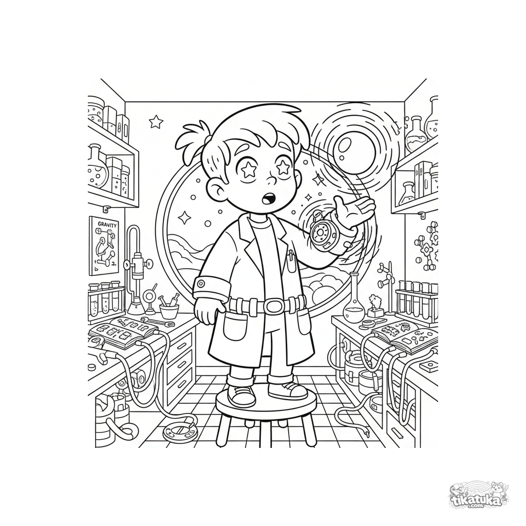 Ausmalbild für Kinder 4-6: Ein Junge in einem geheimen Labor testet ein Gerät, das ein Kraftfeld erzeugt.