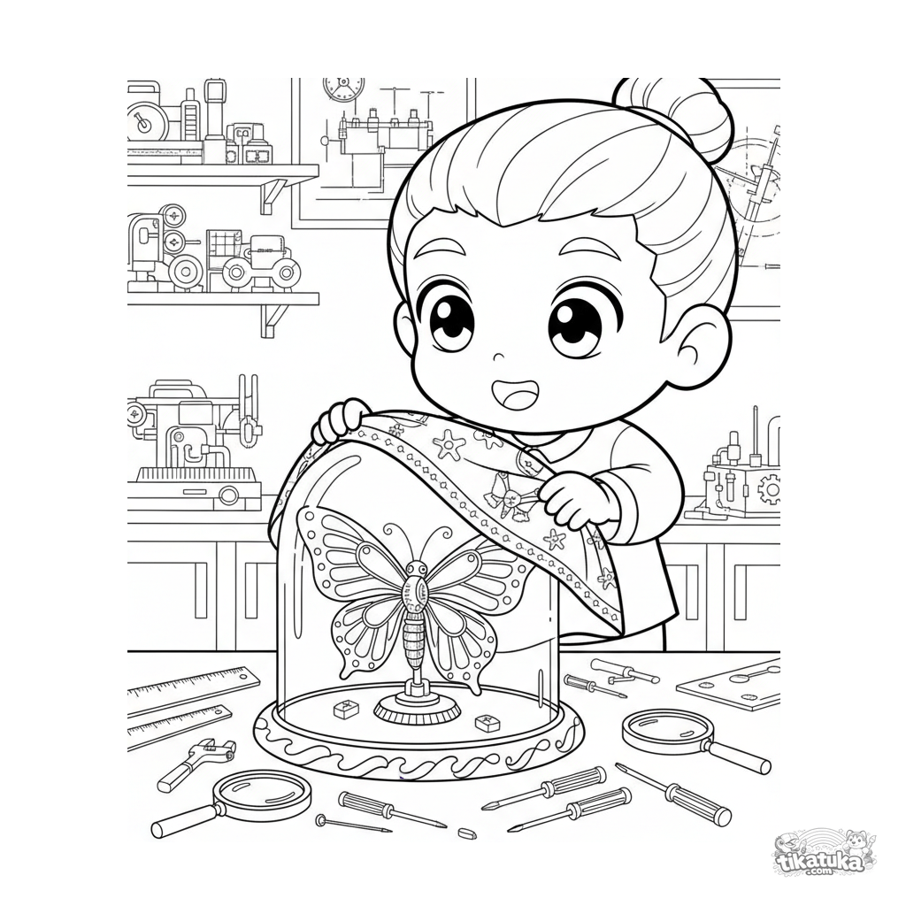 Ausmalbild für Kinder 7-9: Ein Junge in einem Labor enthüllt eine Vitrine mit einem zarten, aufgezogenen mechanischen Schmetterling.