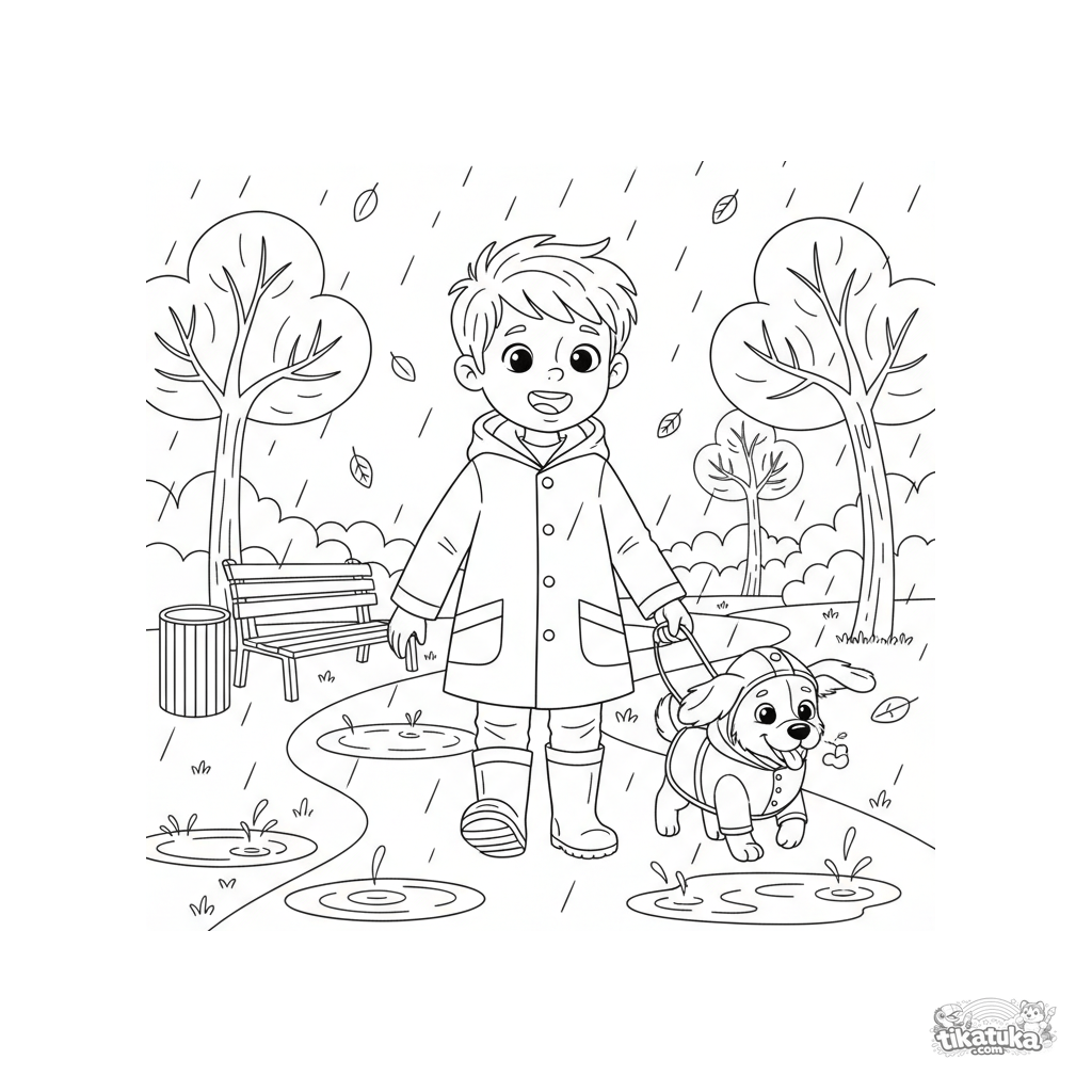 Ausmalbild für Kinder 7-9: ein Junge im Regenmantel geht mit seinem Hund im Herbstpark im Regen spazieren. Mäßiges Detail, ausdrucksstarke Posen.