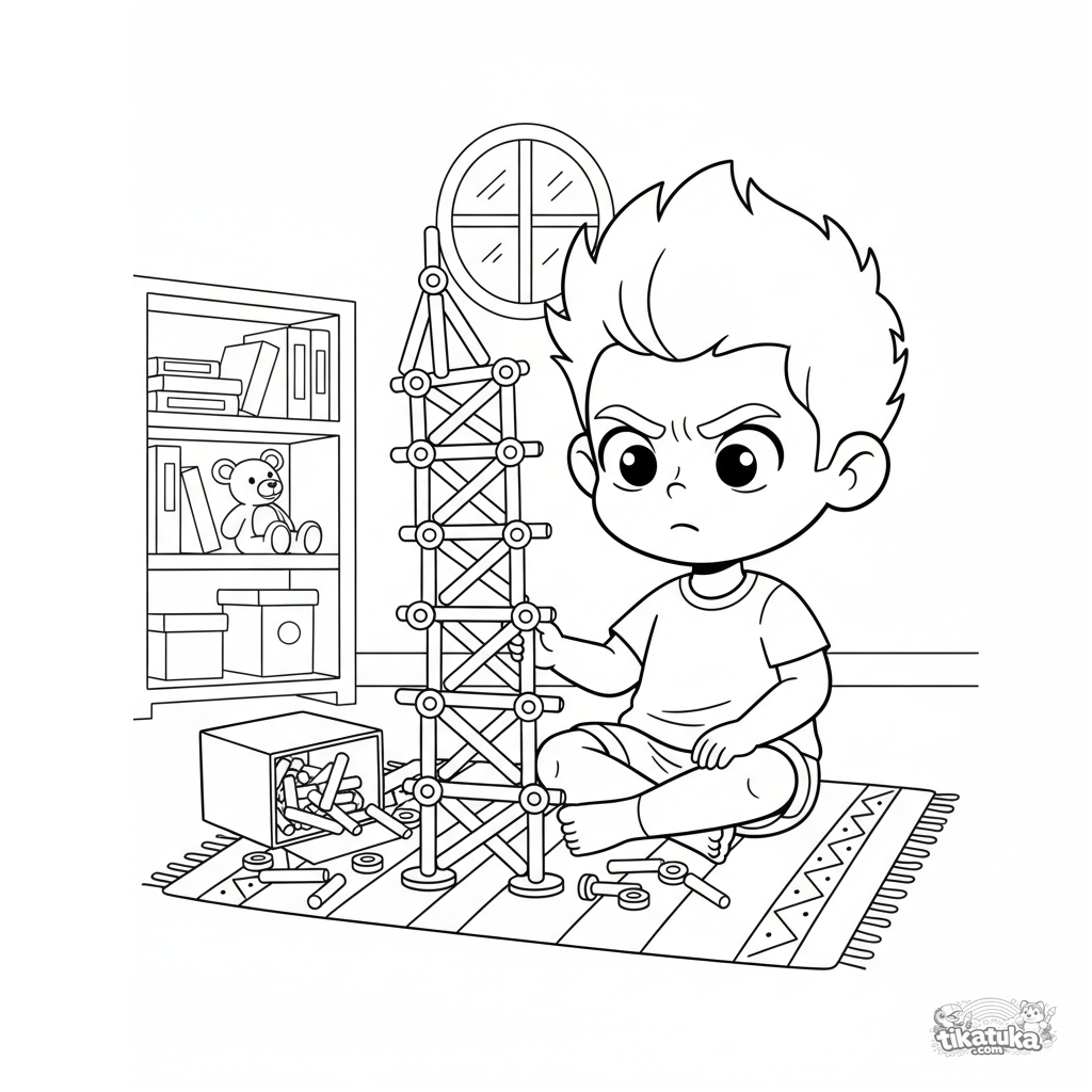 Ausmalbild für Jungen von 4-6 Jahren: ein konzentrierter Junge baut einen hohen Turm aus Bauteilen. Einfache Szene zum Ausmalen.