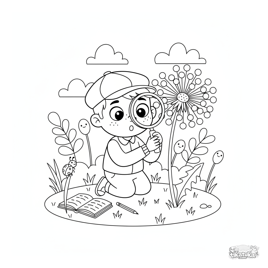 Ausmalbild eines neugierigen Jungen, der mit einer Lupe einen großen Löwenzahn untersucht. Für Kinder von 5 bis 8 Jahren.