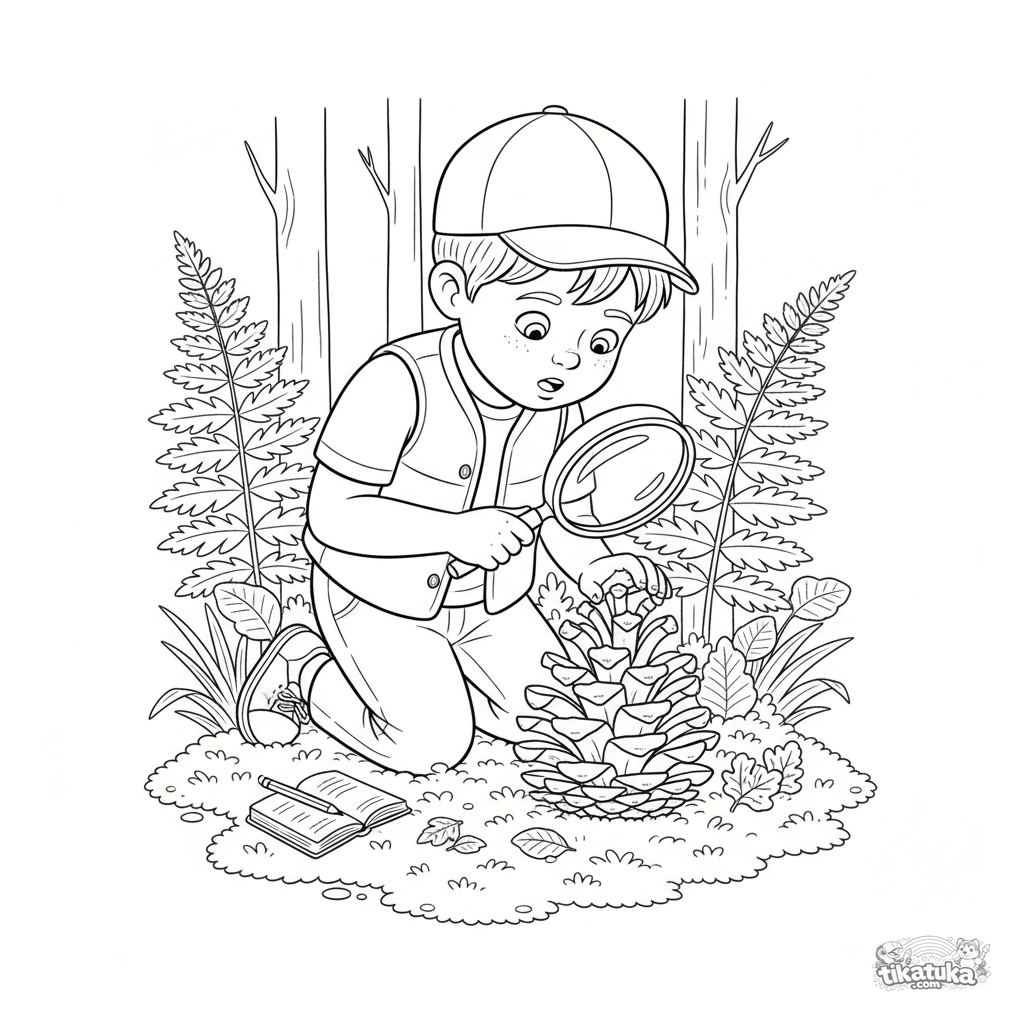 Ausmalbild für Jungen 4-6: Ein neugieriger Junge untersucht mit einer Lupe einen großen Tannenzapfen im Wald. Eine Erkundungsszene.