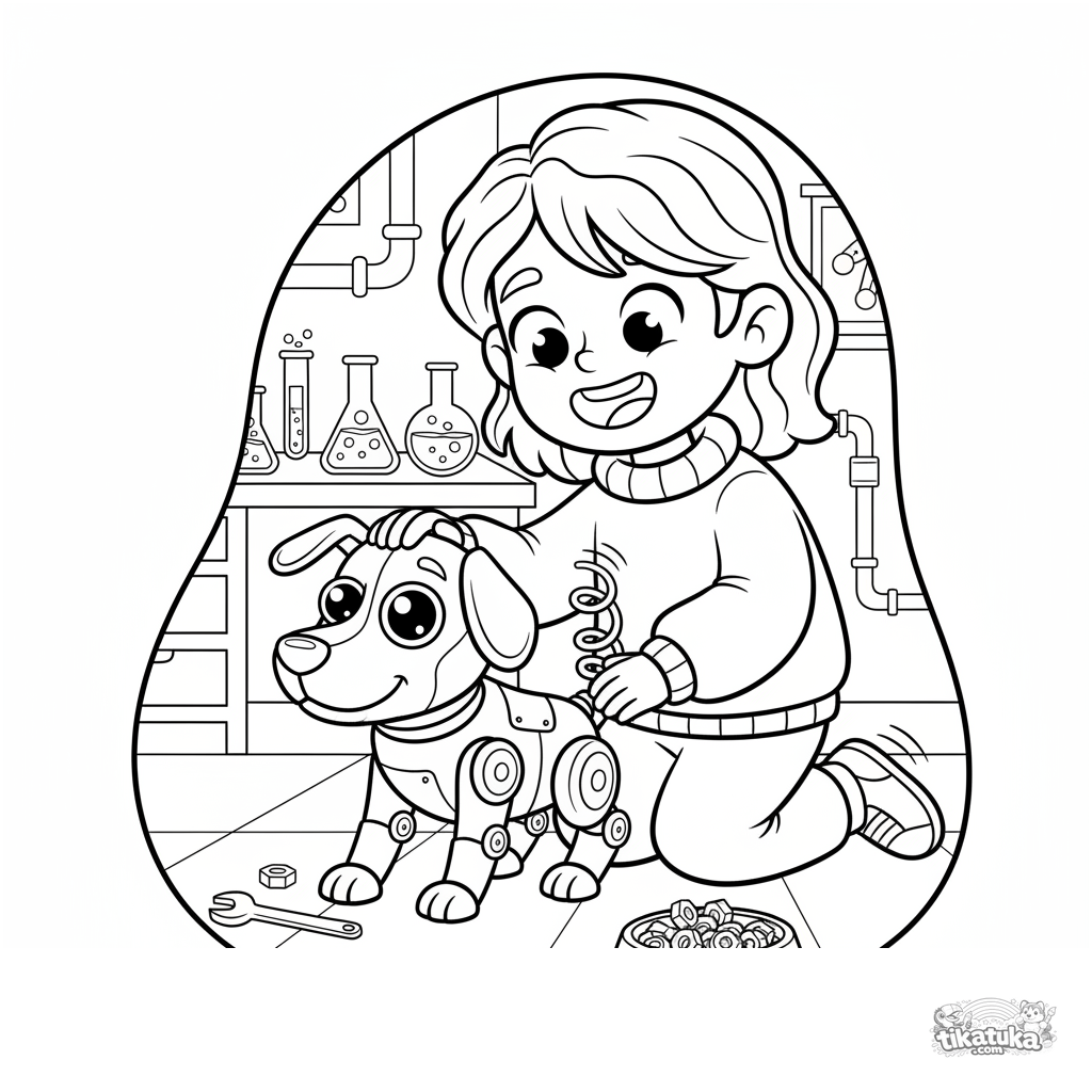 Ausmalbild für Kinder von 4-6 Jahren: ein Junge kümmert sich um seinen mechanischen Haustierhund in einem gemütlichen geheimen Labor.