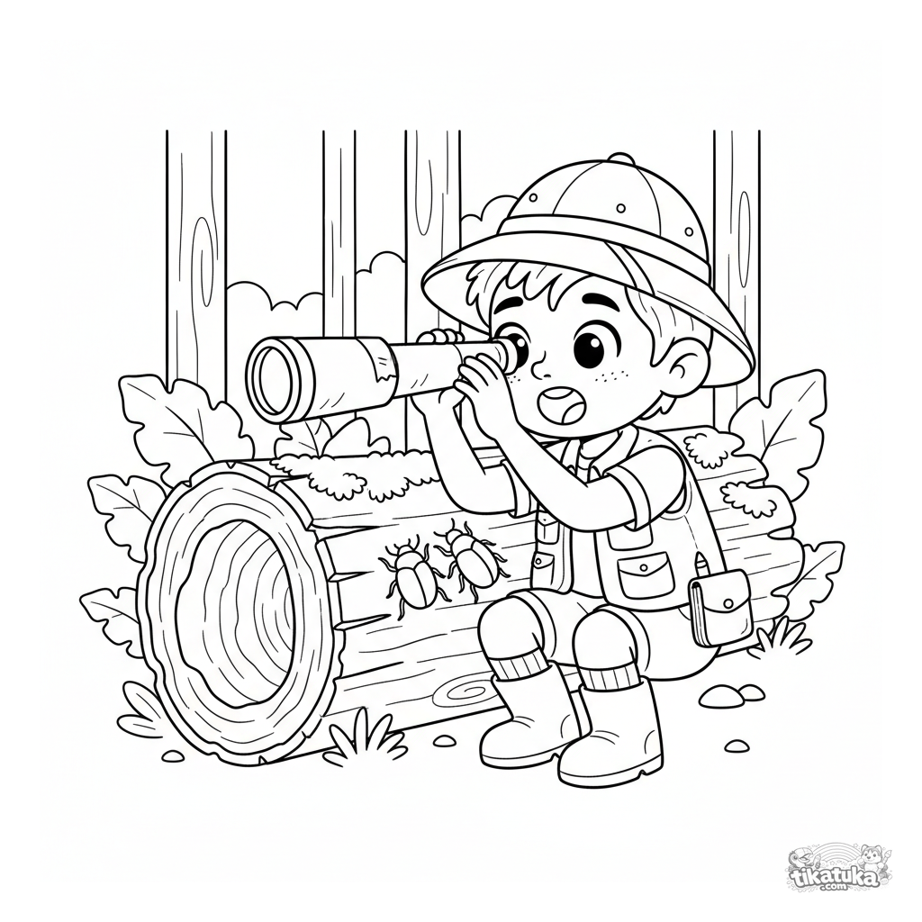 Ausmalbild für Jungen von 4-6 Jahren: Ein junger Entdecker mit Safarihut benutzt ein selbstgebautes Periskop, um in einen großen hohlen Baumstamm im Wald zu schauen.