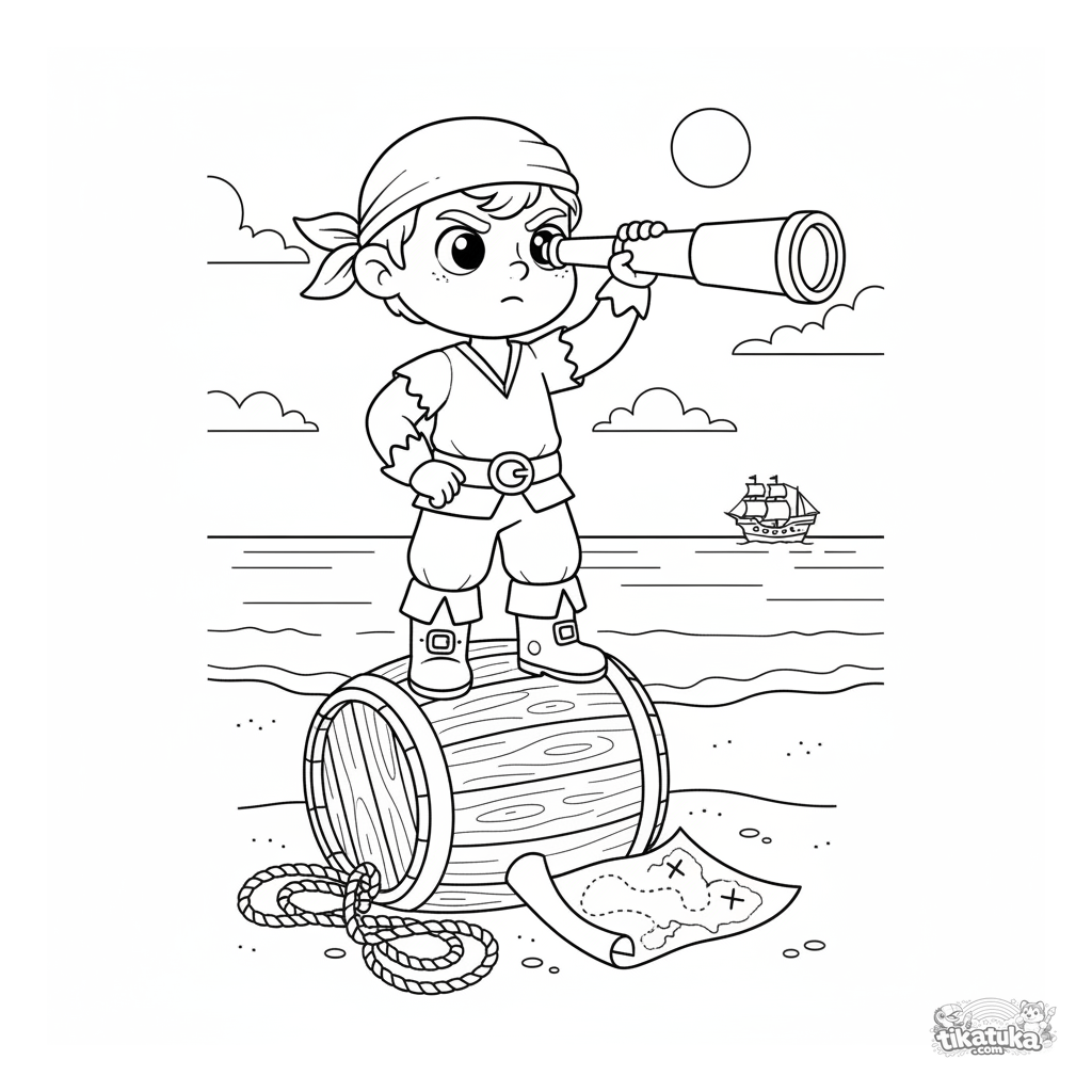 Ausmalbild für Jungen: Ein junger Pirat auf einem Fass schaut durch ein Fernrohr am Strand. Für Kinder von 4-6 Jahren.