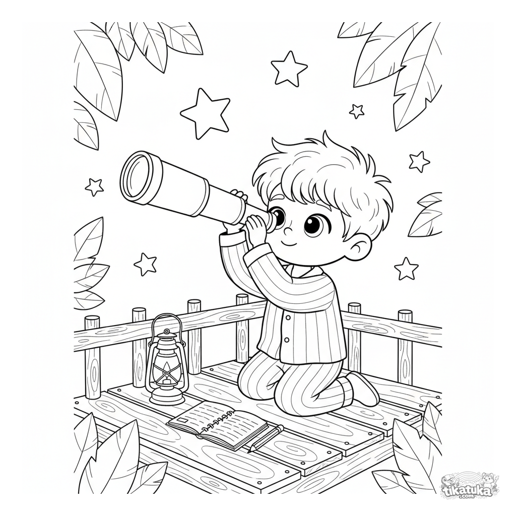 Ausmalbild für Jungen von 4-6 Jahren. Ein neugieriger Junge im Schlafanzug blickt durch ein Teleskop zu den Sternen von seiner Baumhaus-Plattform aus.
