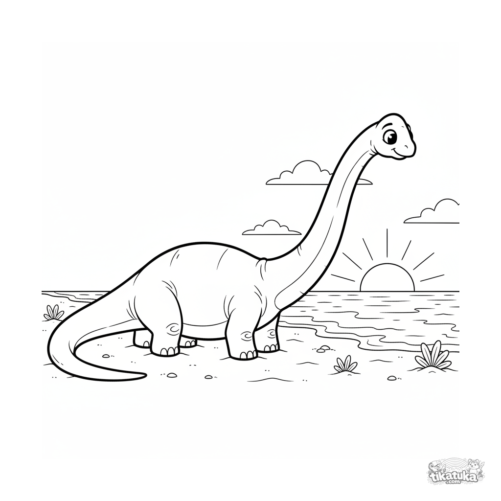 Ausmalbild für Tweens 7-9: Ein Brachiosaurus im Aquarell-Skizzen-Stil ruht friedlich auf dem Sand eines urzeitlichen Ozeanstrands bei Sonnenuntergang.
