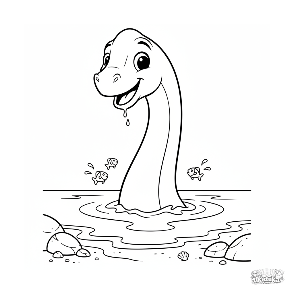 Ausmalbild für Kinder 7-9: ein Brachiosaurus streckt seinen langen Hals aus dem Wasser eines uralten Ozeans in Strandnähe. Neugieriger Ausdruck.