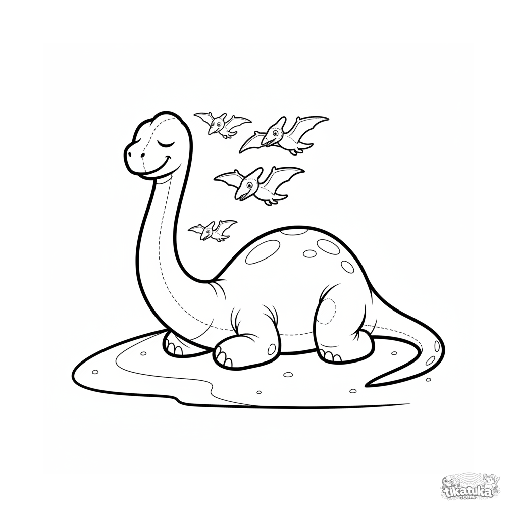 Ausmalbild für Kleinkinder 2-3 Jahre: Ein riesiger Brachiosaurus schläft auf dem warmen Sand eines uralten Ozeanstrands. Sehr einfache Formen, große Details, breite Ränder.