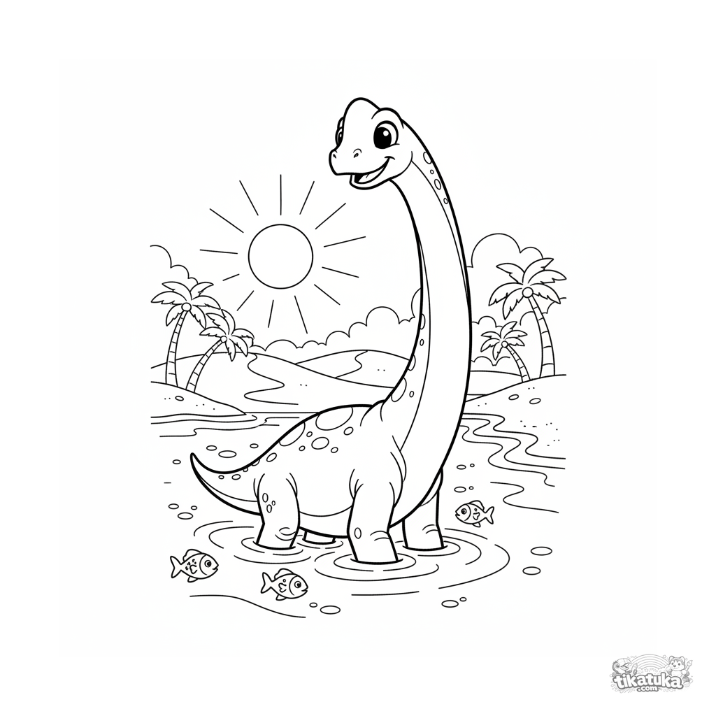 Ausmalbild für Kinder 7-9 im klassischen Stil: Ein majestätischer Brachiosaurus watet im Flachwasser eines urzeitlichen Ozeans. Fließende Linien, epische Szene.