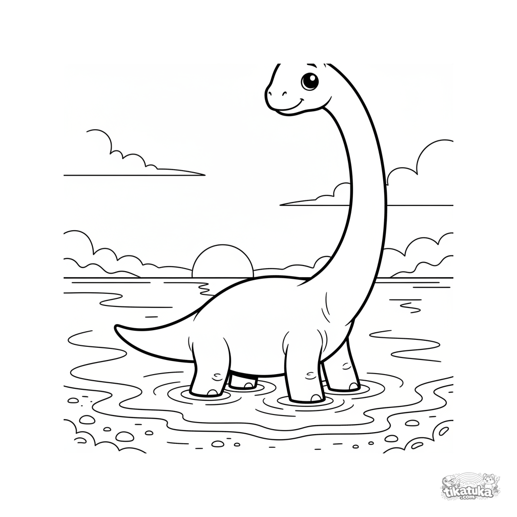 Ausmalbild für 7-9 Jahre: ein majestätischer Brachiosaurus watet durch das ruhige Wasser eines uralten Ozeans vor einer Sonnenuntergangskulisse.