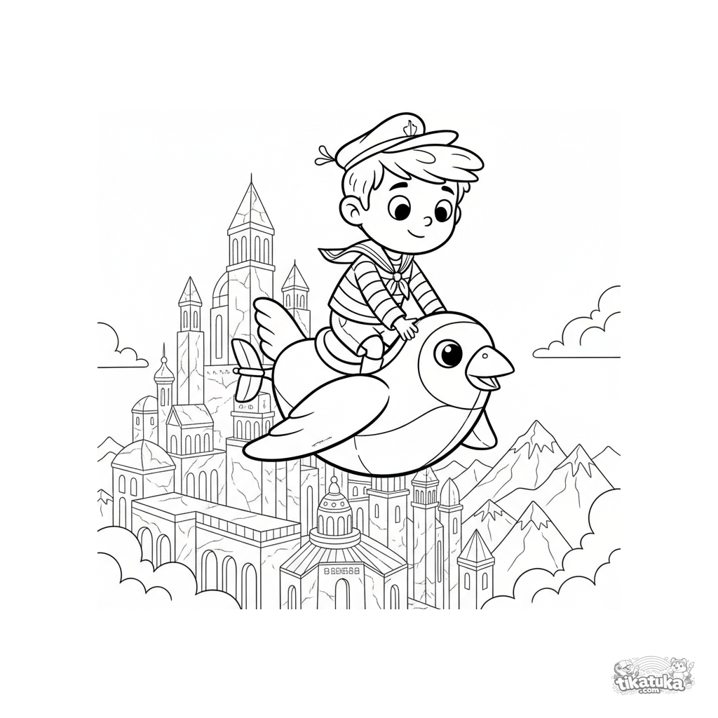 Kinder-Ausmalbild: Ein tapferer Schiffsjunge fliegt mit einem kleinen vogelähnlichen Schiff über die glänzenden Dächer eines riesigen Marmorpalastes.