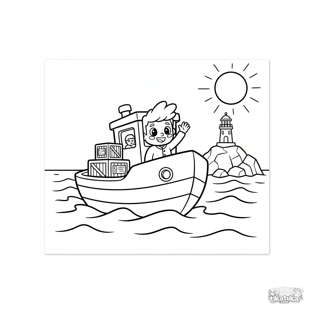 Ausmalbild für Kinder 4-6: ein fröhliches rot-weiß gestreiftes Versorgungsboot bringt Vorräte zu einer Leuchtturminsel.