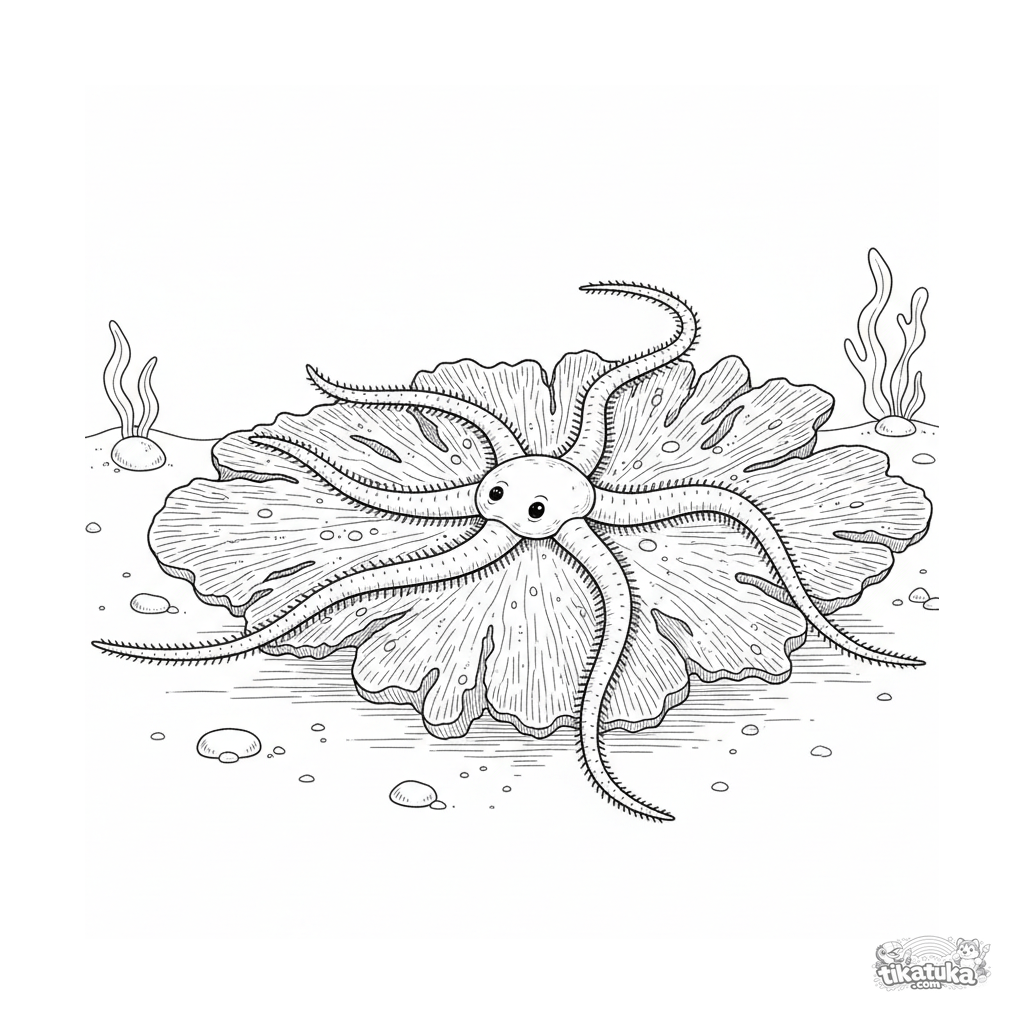 Ausmalbild für Kinder von 7-9 Jahren: ein zarter Schlangenstern kriecht über sonnengebleichte Korallen im Flachwasser. Mäßiges Detail im Stil eines Vintage-Stichs.