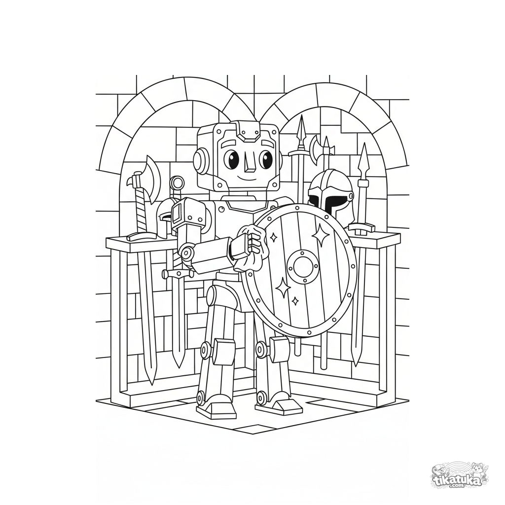Detailliertes Ausmalbild im Konstruktivismus-Stil: Ein Bronze-Automat-Wächter poliert einen Schild in der Waffenkammer der Gorgonenhöhle. Geometrische Formen, mechanische Details, für 10-12 Jahre.