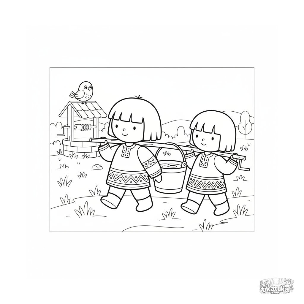 Ausmalbild für Kinder 4-6: Ein Bruder und eine Schwester tragen einen Wassereimer vom Brunnen. Holzspielzeug-Stil, geometrische Formen.