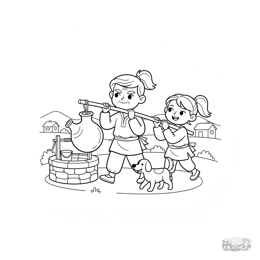 Ausmalbild für Tweens 7-9: Ein Bruder und eine Schwester tragen einen großen Krug lebendigen Wassers vom Brunnen. Warmherzige Geschichte über Hilfsbereitschaft, zwei Figuren.