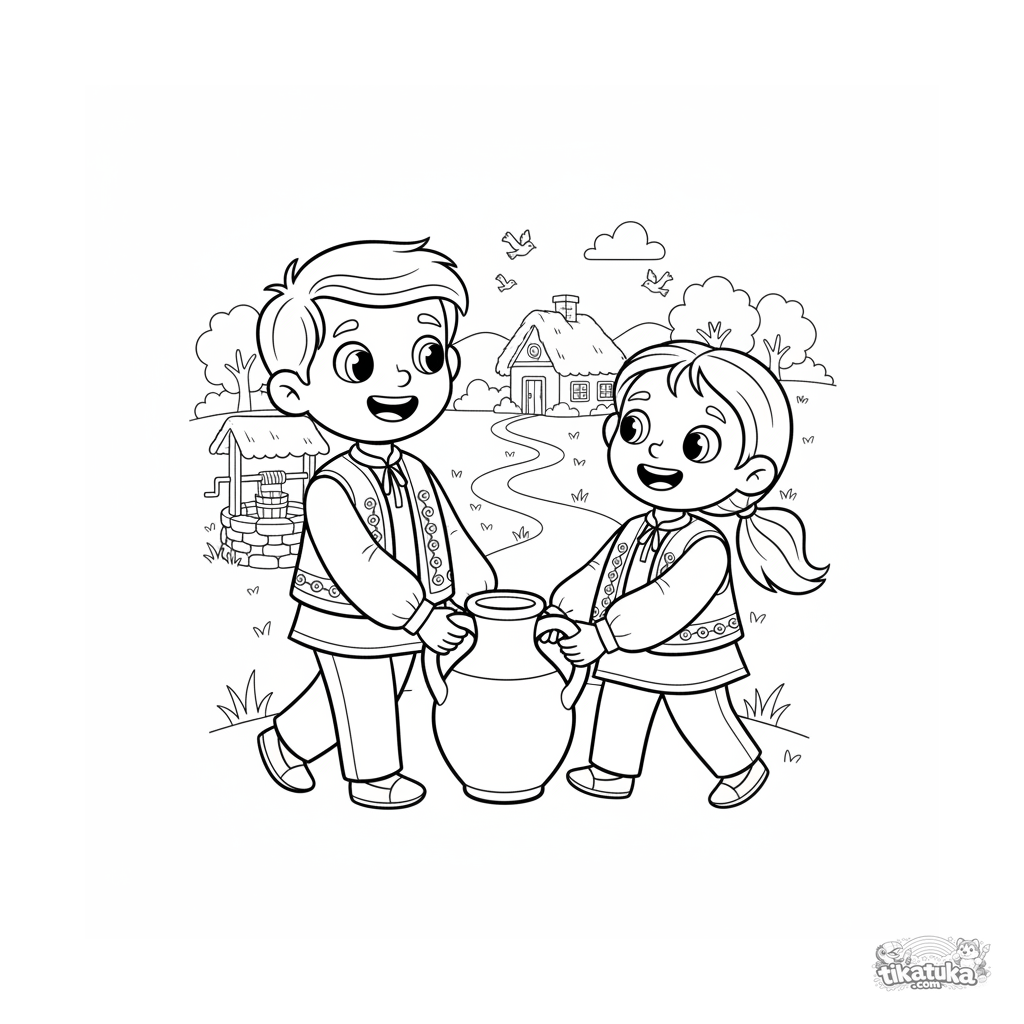 Ausmalbild für Kinder 7-9: Ein Bruder und eine Schwester in Volkwesten tragen einen großen Wasserkrug vom Brunnen. Szene über Zusammenarbeit und Dorfleben.