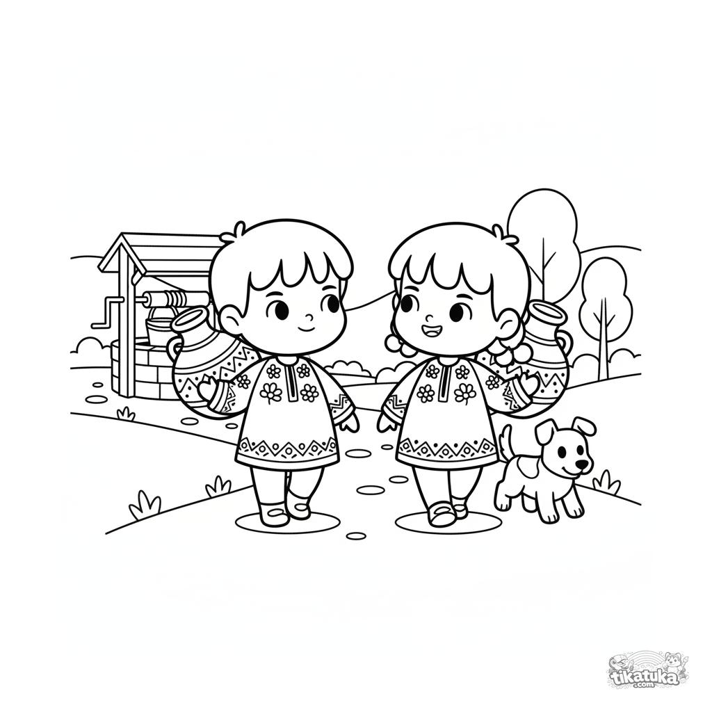 Ausmalbild für Kinder 4-6: Ein Bruder und eine Schwester in Volkstracht tragen Wasserkrüge vom Brunnen. Klare geometrische Formen, positive Geschichte.