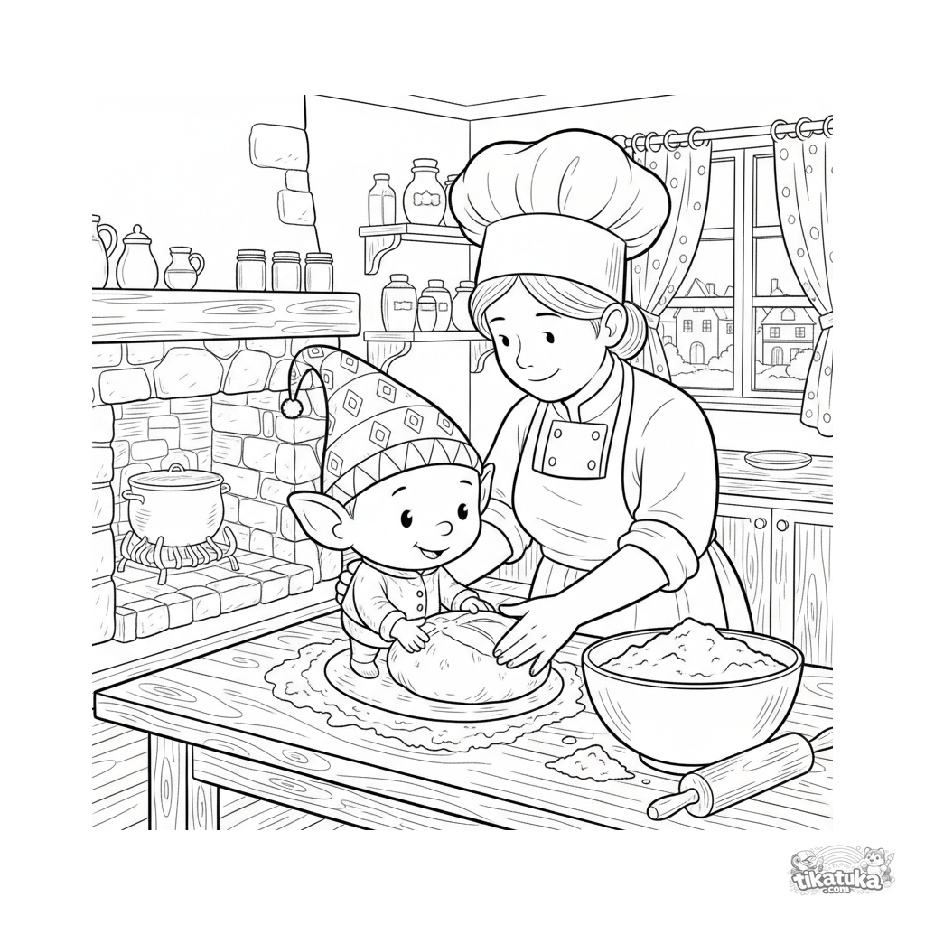 Ausmalbild für ältere Kinder: Ein winziges Heinzelmännchen hilft einem Bäcker, Brotteig auf einem Holzküchentisch zu formen. Detaillierte europäische Folklore-Szene mit Mehl und Nudelholz.