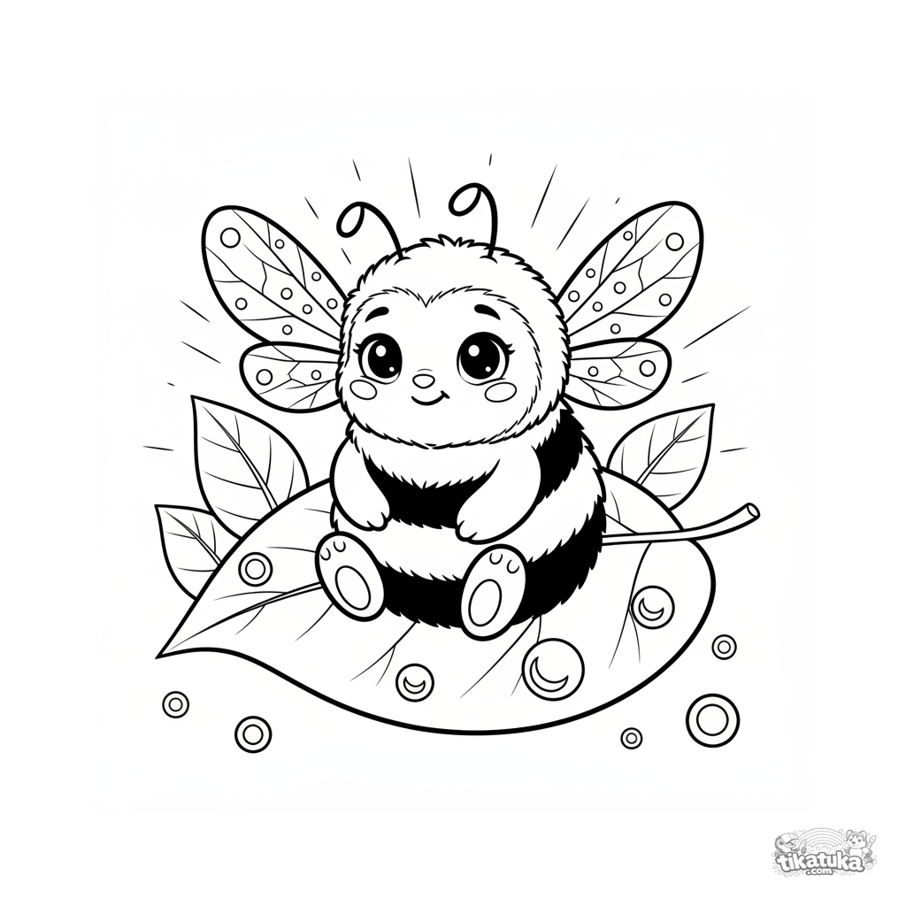 Ausmalbild für Tweens 7-9: Eine flauschige Hummel trocknet ihre Flügel auf einem großen Blatt nach einem Tautropfen-Schauer. Niedliche und friedliche Szene mit moderaten Details.