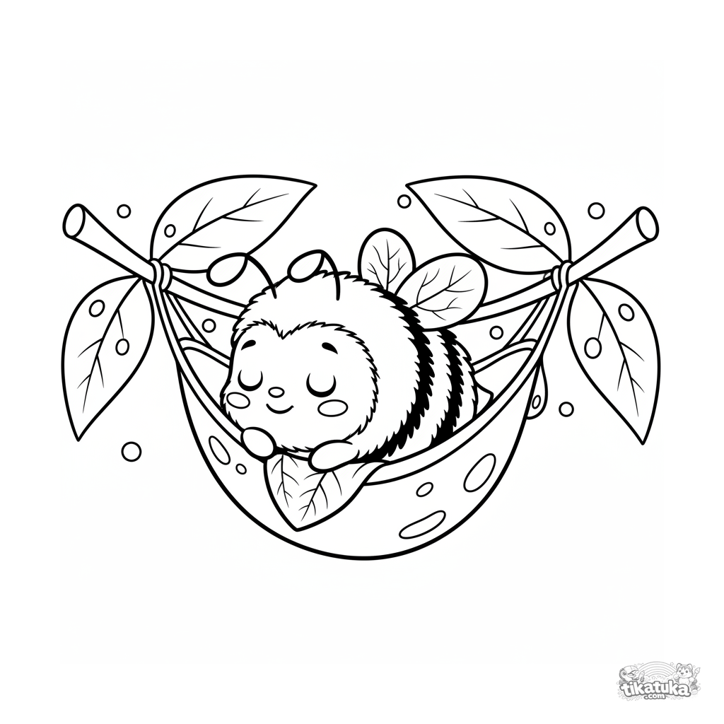 Einfaches Kleinkind-Ausmalbild: eine Hummel schläft in einer Tautropfen-Hängematte auf einem großen Blatt. Große Formen, wenig Details.
