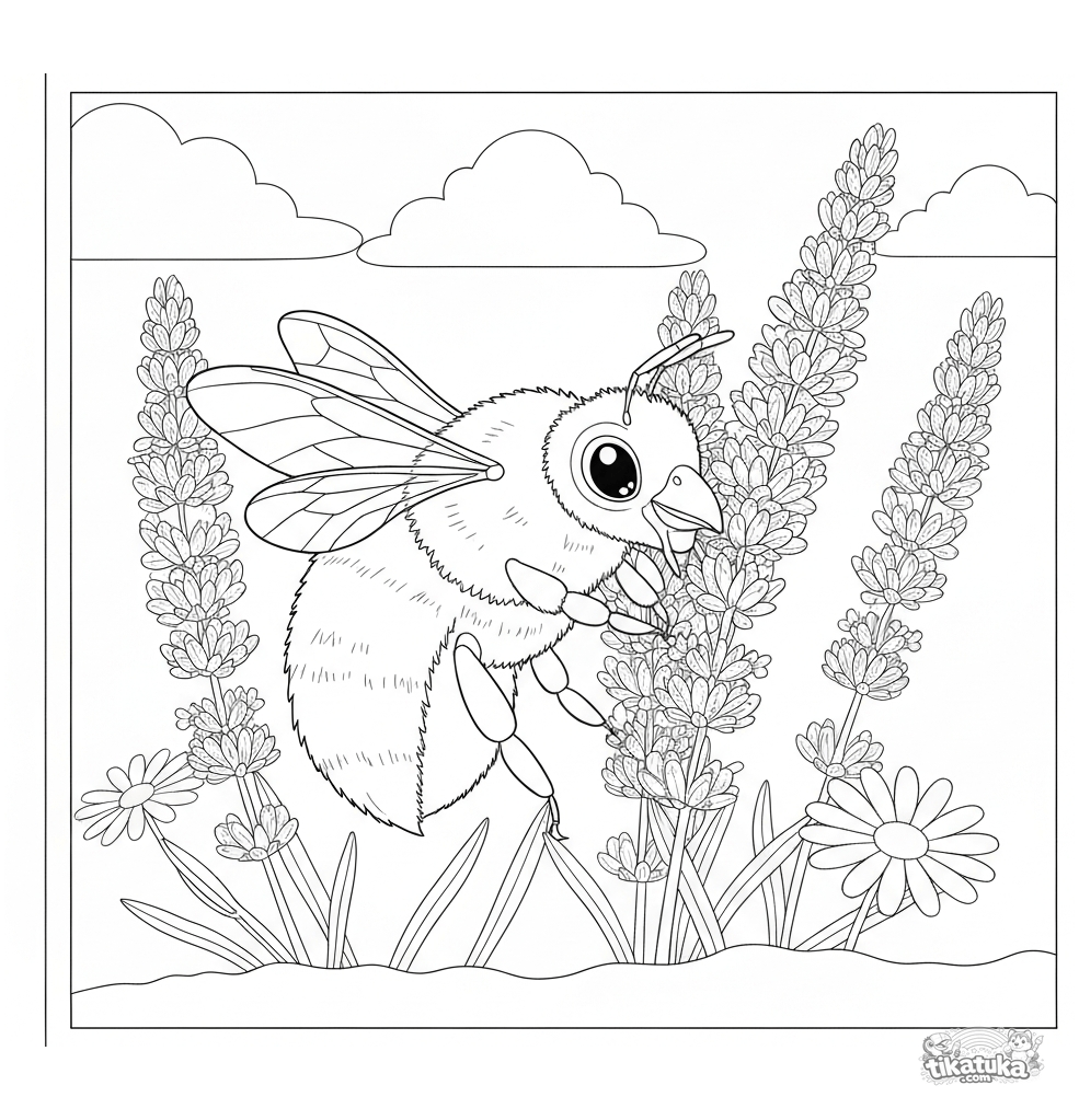 Ausmalbild einer Hummel für Kinder von 6-9 Jahren. Die Hummel bestäubt Lavendelblüten an einem sonnigen Sommertag, Beine voller Pollen.