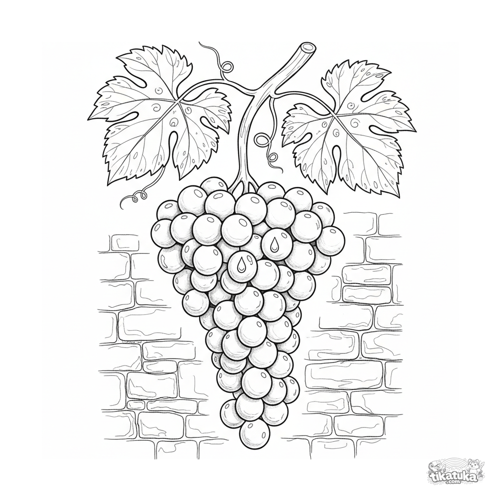 Komplexes Ausmalbild für Kinder 10-12: Eine realistische Traube an der Rebe mit einem Tautropfen. Aquarell-Skizzen-Stil, detailliert.