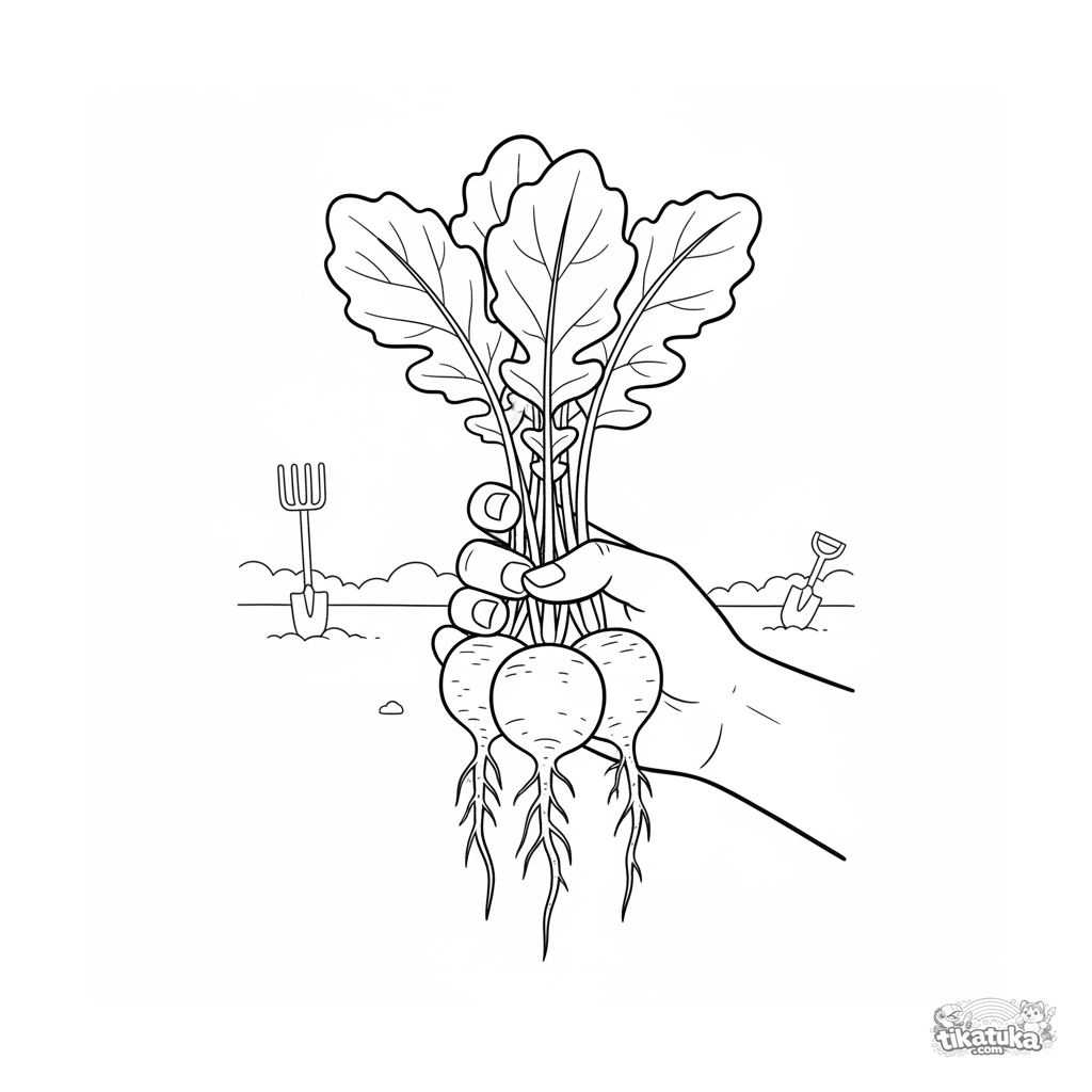 Lehrreiches Ausmalbild eines Bunds Radieschen mit Wurzeln und Erde. Für Kinder von 7-9 Jahren. Realistischer naturalistischer Stil.