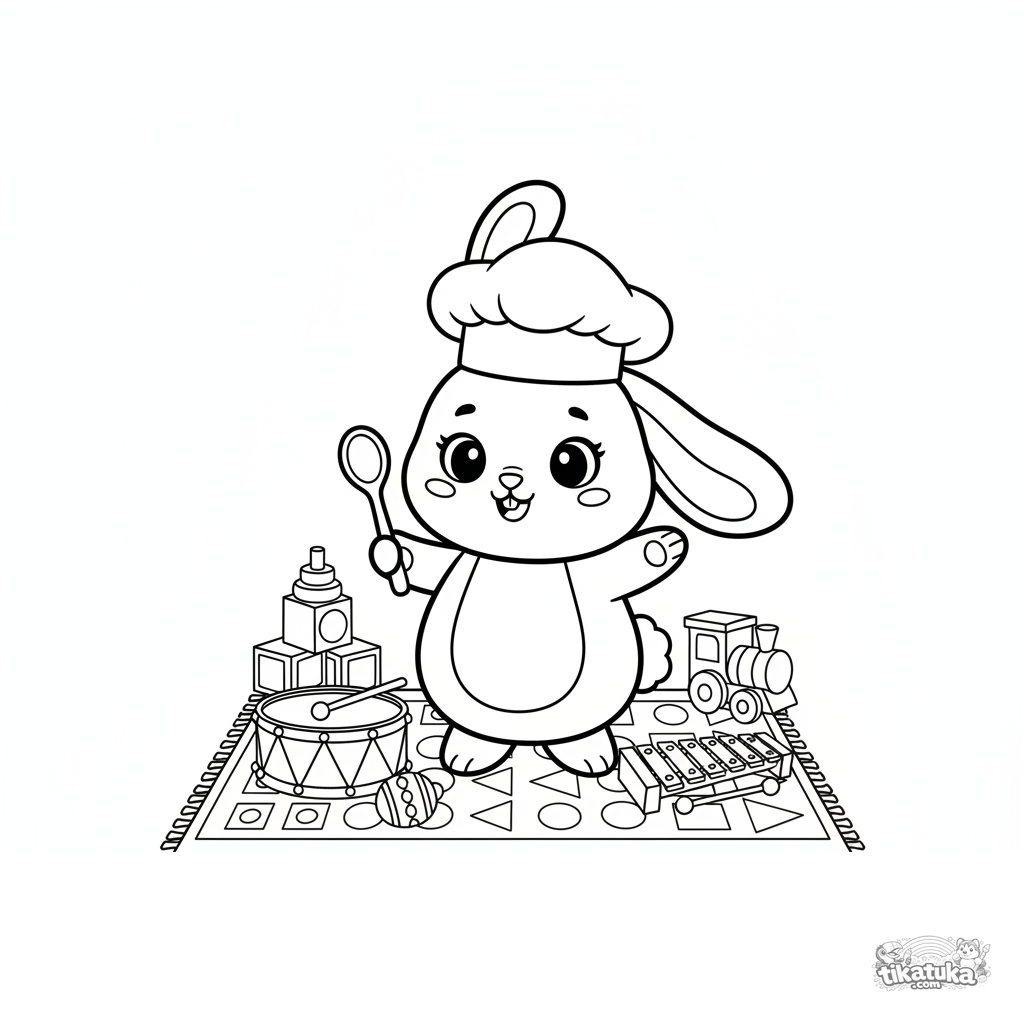 Ausmalbild für Kinder 4-6: Häschen-Bäcker dirigiert ein Spielzeuginstrumenten-Orchester. Plüschmaskottchen-Stil, einfache Instrumentenformen, breite, saubere Ränder zum Ausmalen.