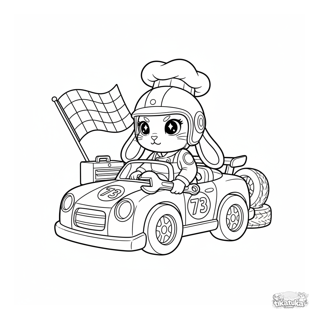 Ausmalbild für Jungen 4-6: Hasen-Bäcker mit Helm arbeitet als Mechaniker an der Boxengasse und zieht ein Rad an einem Rennwagen fest. Geometrischer Holzspielzeug-Stil.
