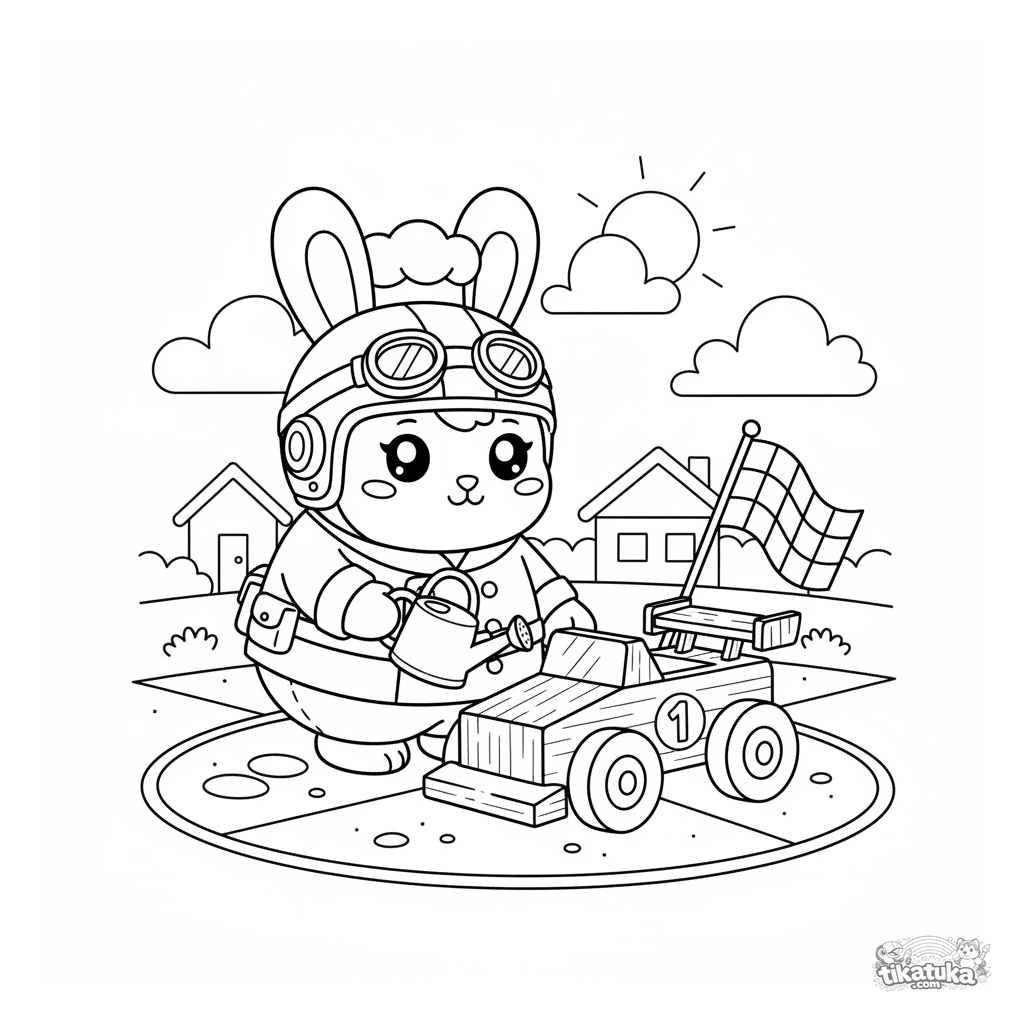 Ausmalbild für Jungen 4-6: Häschen-Bäcker als Rennfahrer beim Boxenstopp für ein Spielzeugauto. Plüschmaskottchen-Stil, einfache Formen, breite Ränder.