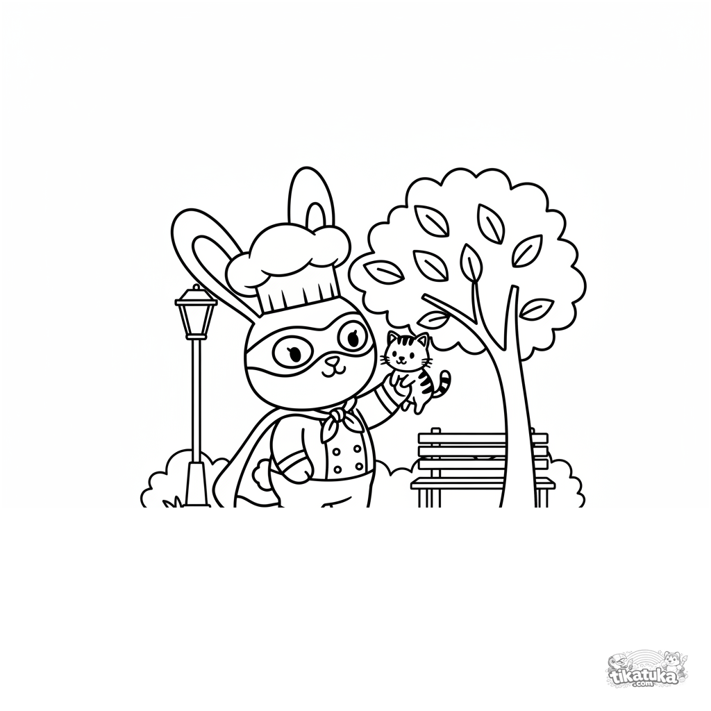 Ausmalbild für Kinder 4-6: Superheld Hasen-Bäcker mit Maske und Umhang rettet ein Kätzchen, das in einem Parkbaum feststeckt. Geometrischer Holzspielzeug-Stil.