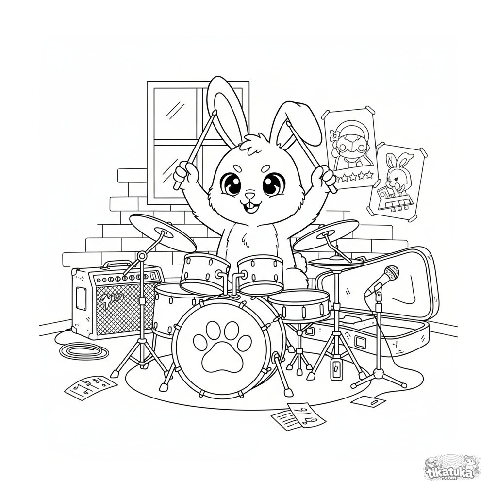 Kinder-Ausmalbild: ein Häschen-Schlagzeuger probt in einer Garage. Lustige Szene mit Schlagzeug und Musikausrüstung.