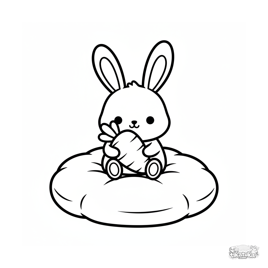 Ausmalbild für Kinder 2-3 Jahre: ein süßes Chibi-Häschen sitzt auf einem Kissen und umarmt ein Karottenkissen. Einfache große Formen.