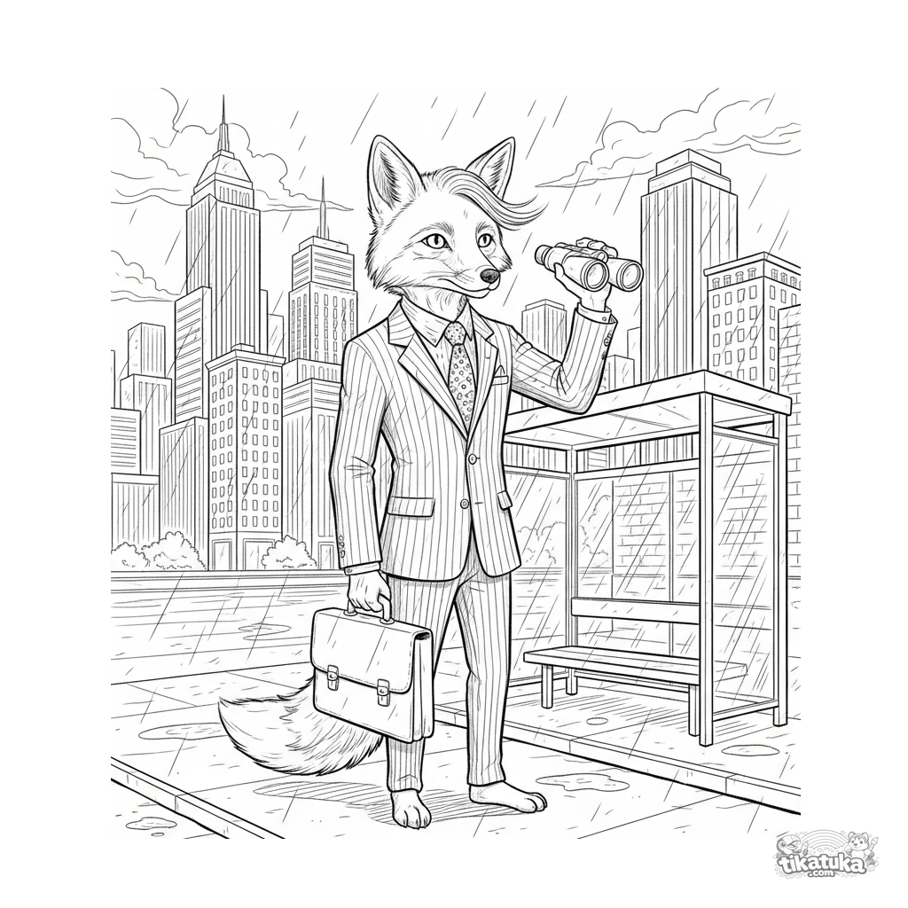 Ausmalbild für Kinder 10-12: ein Fuchs im Geschäftsanzug mit Aktentasche und Fernglas an einer regnerischen Bushaltestelle, der zu Banken schaut. Szene im Urban-Sketch-Stil.