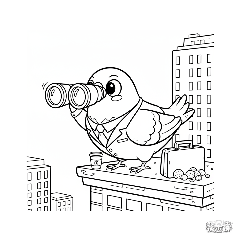 Ausmalbild für Kinder 10-12: Eine Geschäftstaube im Anzug mit Fernglas auf einem Wolkenkratzervorsprung, auf der Suche nach ihrem Gehalt. Lustige, detaillierte Szene.