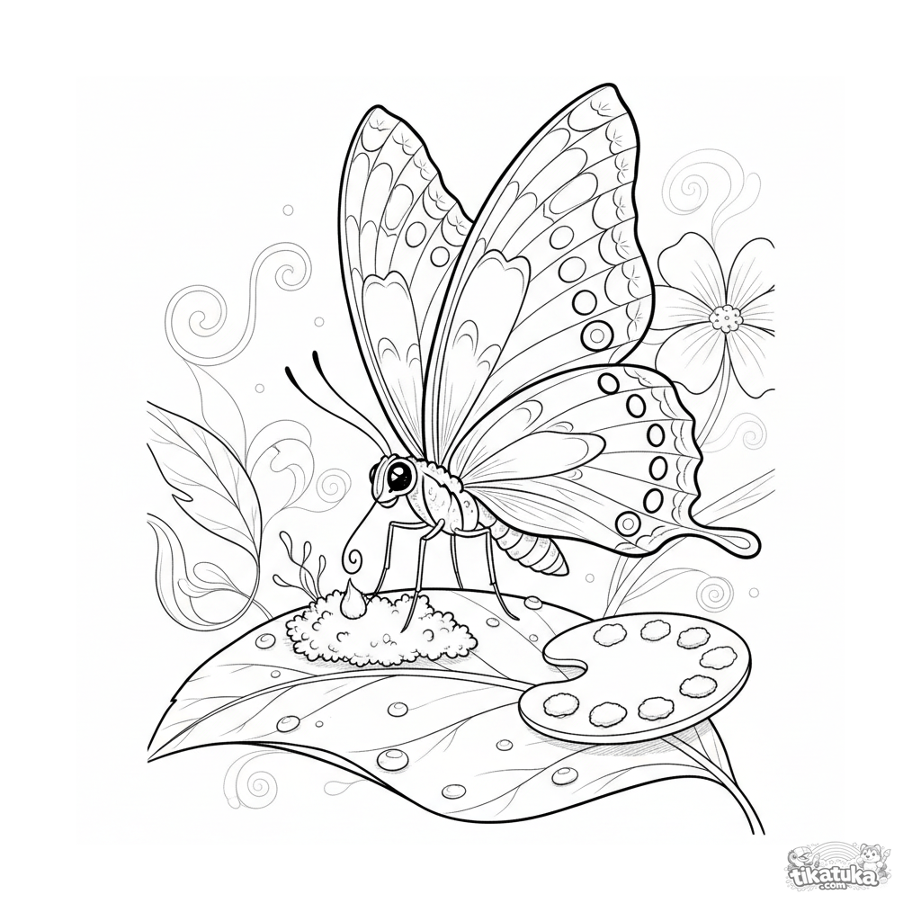Ausmalbild für 7-9 Jahre: Eine Schmetterlings-Künstlerin malt mit Pollen auf Moos. Szene im Aquarell-Skizzen-Stil.